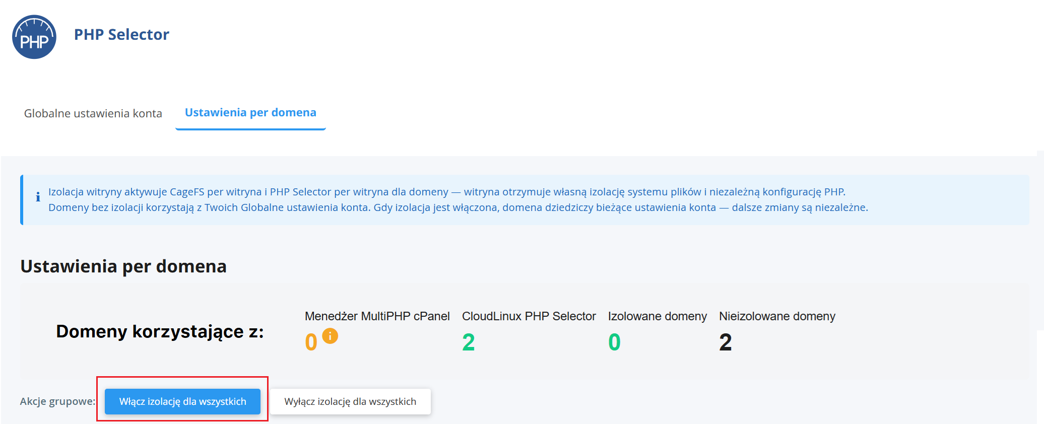 - Pojawi się lista domen przypisanych do Twojego konta hostingowego. Aby objąć ochroną wszystkie witryny jednocześnie, skorzystaj z przycisku: Włącz izolację dla wszystkich