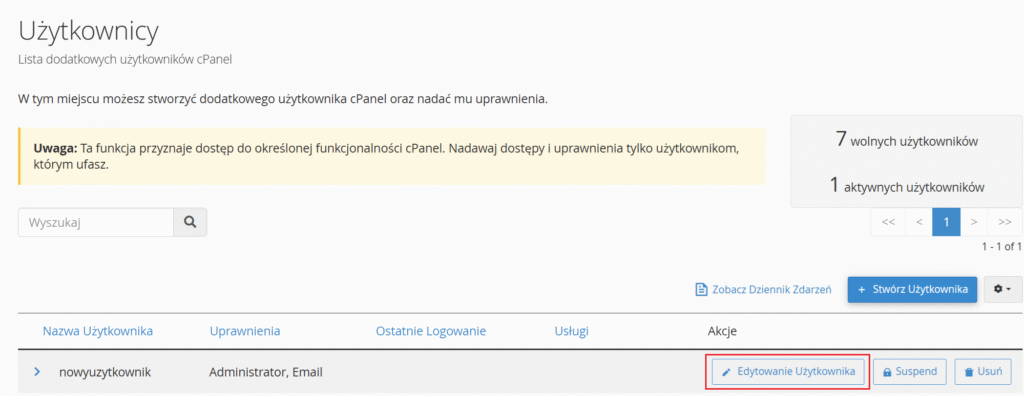 Po zalogowaniu do cPanelu, możesz utworzyć kolejne konta użytkowników, które będą miały dostęp do panelu administracyjnego cPanel. Dodatkowe konta w cPanel możesz utworzyć dla Twoich współpracowników lub klientów. Po utworzeniu nowego konta użytkownika, możesz później przejść do jego edycji.