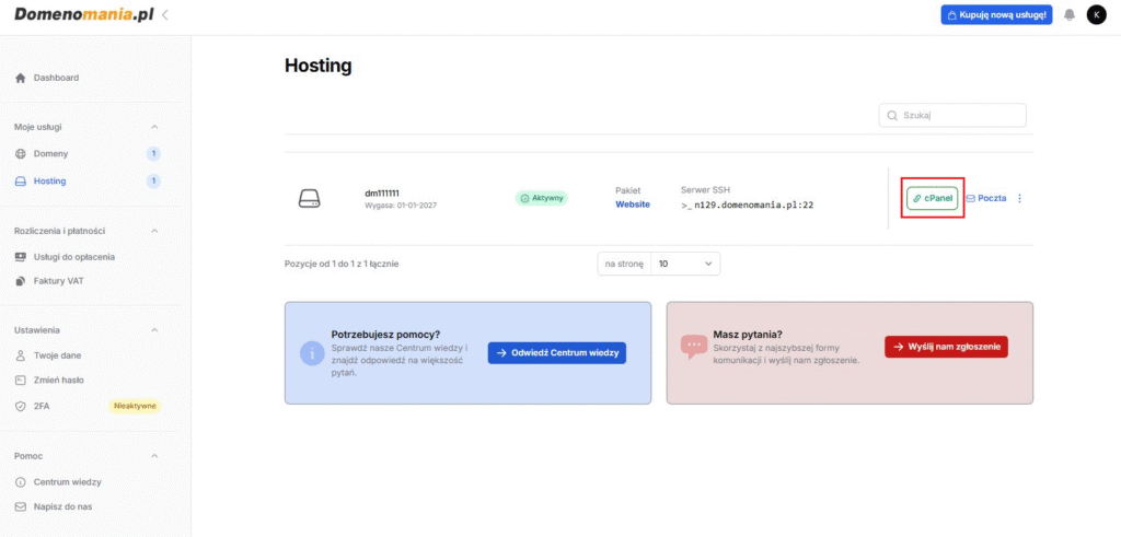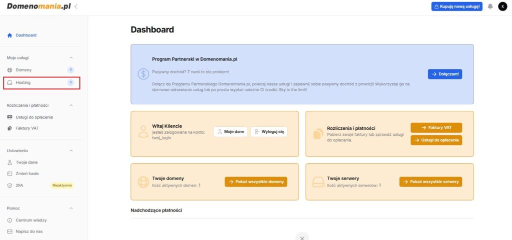 - W lewym bocznym menu wybierz: Hosting